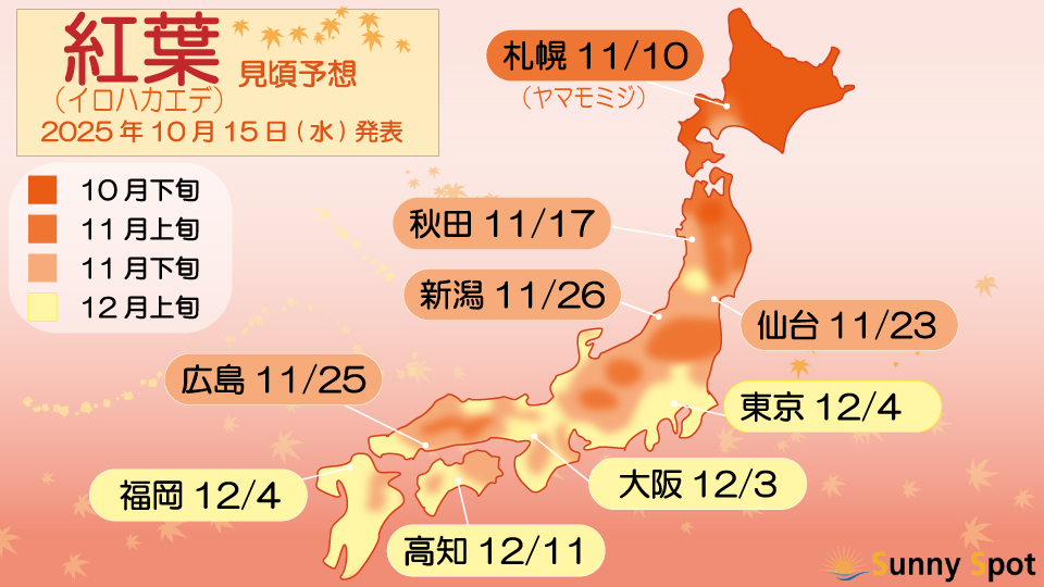 Today, the 15th (Wednesday), our company Sunny Spot announced the first forecast for the best time to see autumn leaves in 2025. Please use this as a reference when planning your next fall foliage viewing trip.