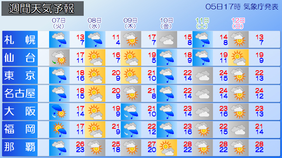 From now on, the temperature will be higher than normal, and there will be many summer days with temperatures above 25c. However, on the 7th (Tuesday), a strong cold air will temporarily flow in, and there are likely to be places where the temperature will drop significantly compared to the previous day, the 6th, especially in areas along the Sea of Japan such as northern Japan and Hokuriku. Please choose your clothing carefully.