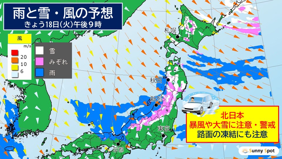 Today, the 18th (Tuesday), it's snowing and raining on the Japan Sea side, and temperatures are dropping nationwide