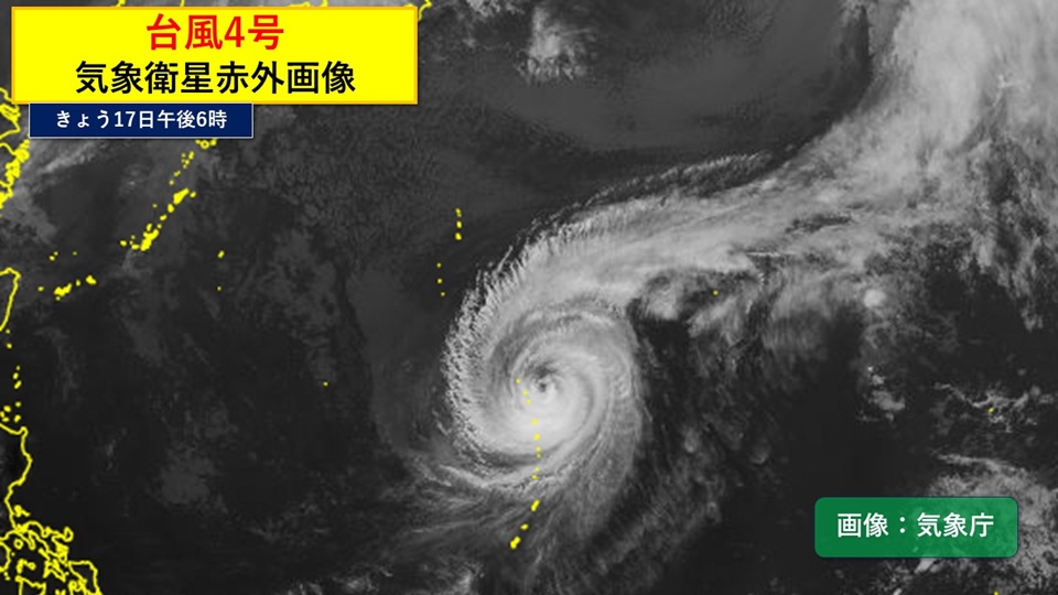 As of 6:00 p.m. today, the 17th, Typhoon No. 4 is located near Ogasawara and is moving northeast at a speed of approximately 15 kilometers per hour.