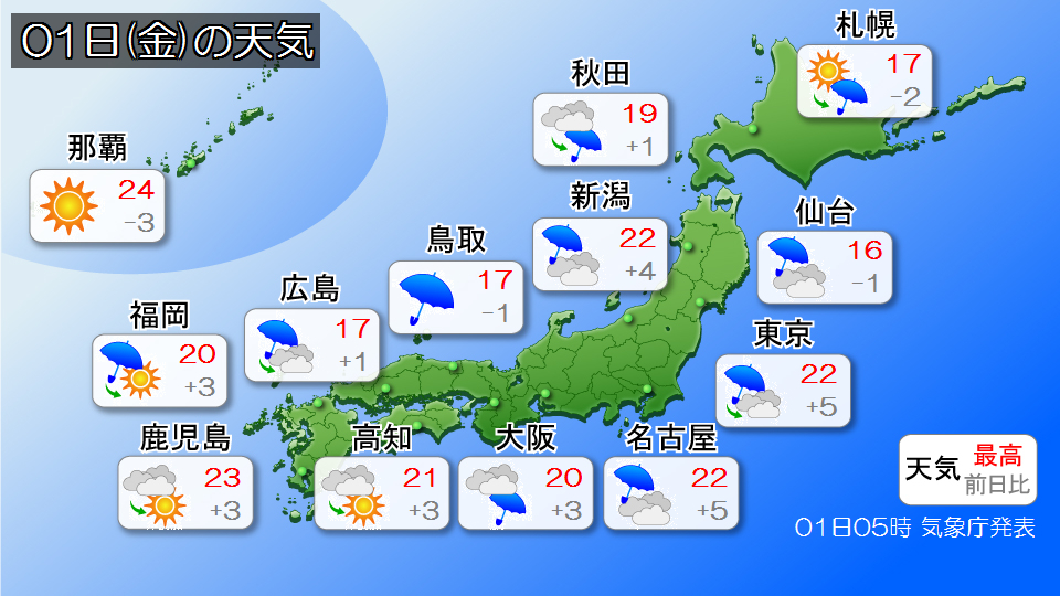 Clouds will gradually spread over western Japan, and there are likely to be localized showers in the evening. Even if there is no umbrella symbol in the weather forecast, it is a good idea to carry a foldable umbrella in case you will be returning home late.