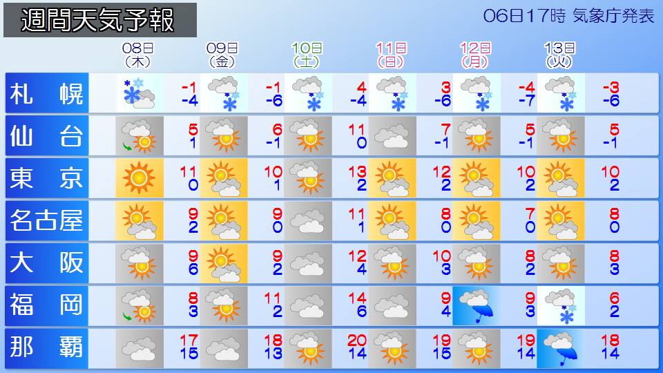 The following day, on the 8th (Thursday), a rapidly developing low pressure system will move toward the Sea of Okhotsk, and the front will pass near northern Japan, which is expected to bring about a winter-like pressure pattern around Japan once again.