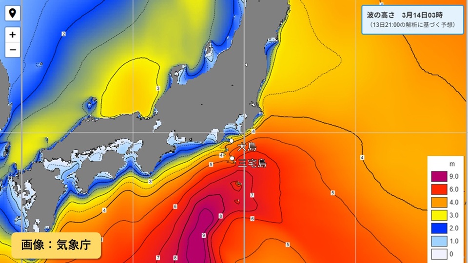 The Izu Islands and Ogasawara Islands will experience rough weather due to the effects of low pressure. There is a risk of localized heavy rain accompanied by thunder, so please be careful of landslides and flooding of low-lying areas due to heavy rain. Also, from around the 15th, caution and vigilance are required due to strong winds and high waves accompanied by swells.