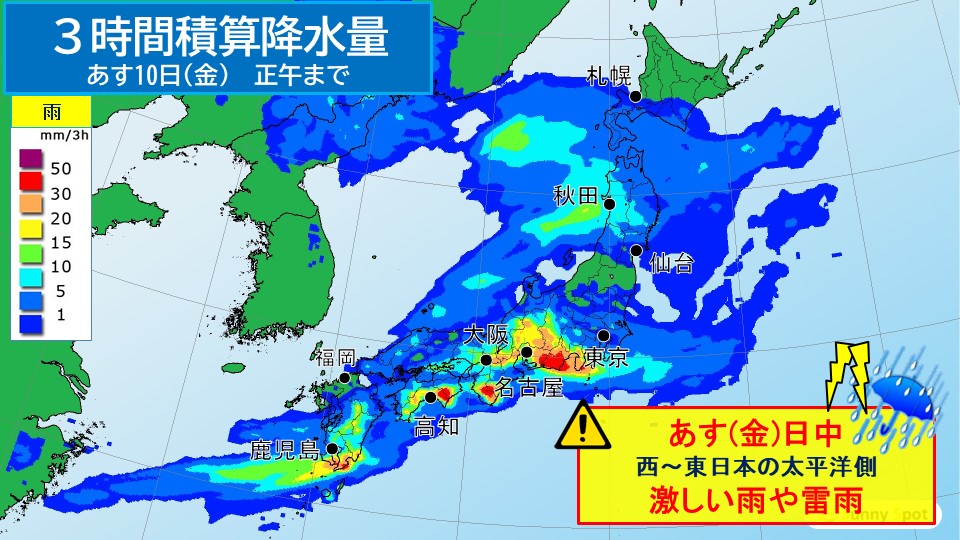 On the 10th (Friday), a low pressure system will move toward the Sea of Japan and continue to develop as it moves northeast. Rain will fall over a wide area near Japan as the front passes. Please be careful as the rain may become heavier temporarily. It is also possible that low pressure and winds blowing toward the front will cause torrential rain. Please check the latest information and be careful when going out.