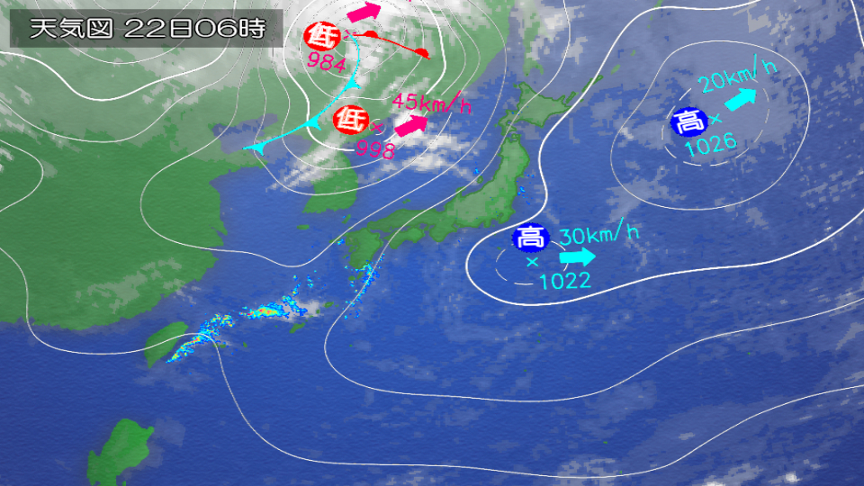 Tomorrow, the 22nd (Sunday), a front is expected to extend into the East China Sea, and another front is expected to extend from the Sea of Japan to western Japan.