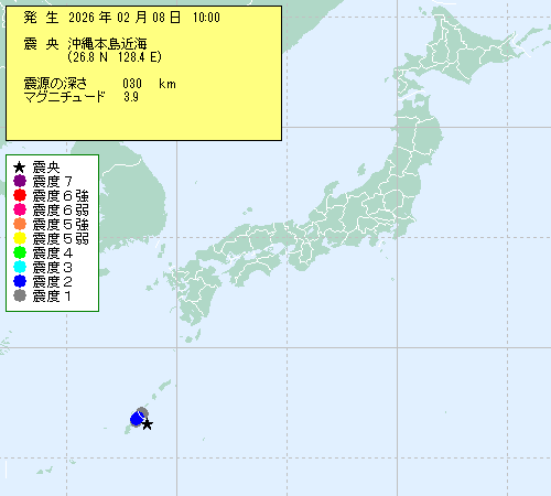 震源地は、沖縄本島近海 (26.8N,128.4E)