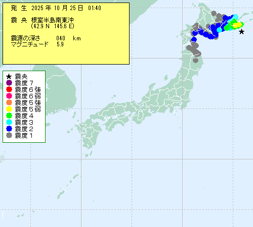 | 2025年10月25日 01時40分 | ????????東?? (42.9N,145.6E) |