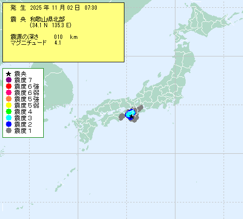 震源地は、和歌山県北部 (34.1N,135.3E)