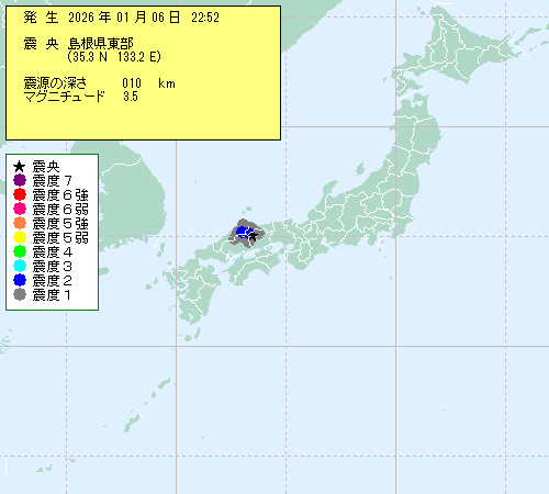 震源地は、島根県東部 (35.3N,133.2E)
