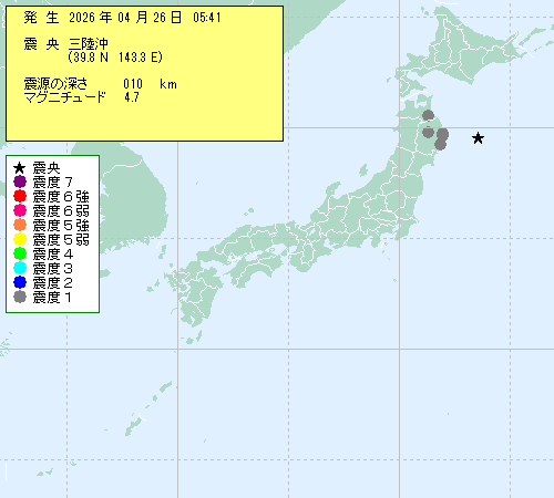 | 2026年04月26日 05時41分 | O???? (39.8N,143.3E) |