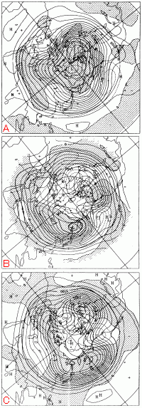 次ページのA、B、Cの天気図は、それぞれある年の1月の月平均500hPa天気図で、陰影域は平年より高度の低い領域を示している。