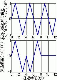 下図は、大気境界層内のある点において12秒間に観測された風速の鉛直成分と気温のそれぞれの偏差を模式的に示したものである。
