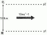"北半球において、下図のように等圧線 p1とp2とに挟まれた南北幅100kmの水平面内の領域で、