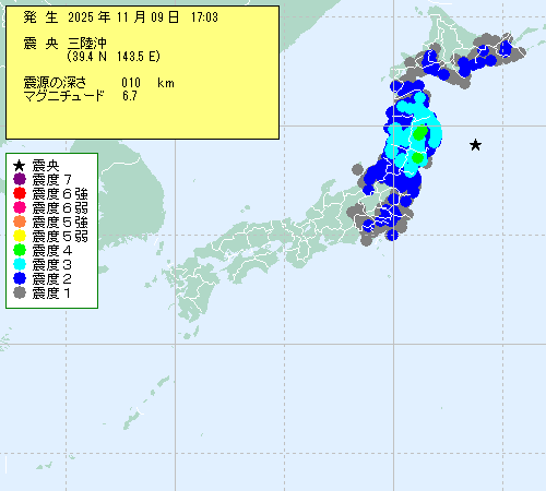 | 2025年11月09日 17時03分 | O???? (39.4N,143.5E) |