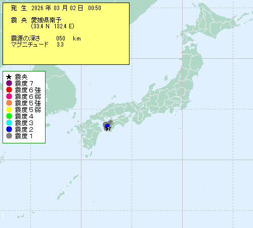 | 2026年03月02日 00時50分 | ??Q????\ (33.4N,132.4E) |