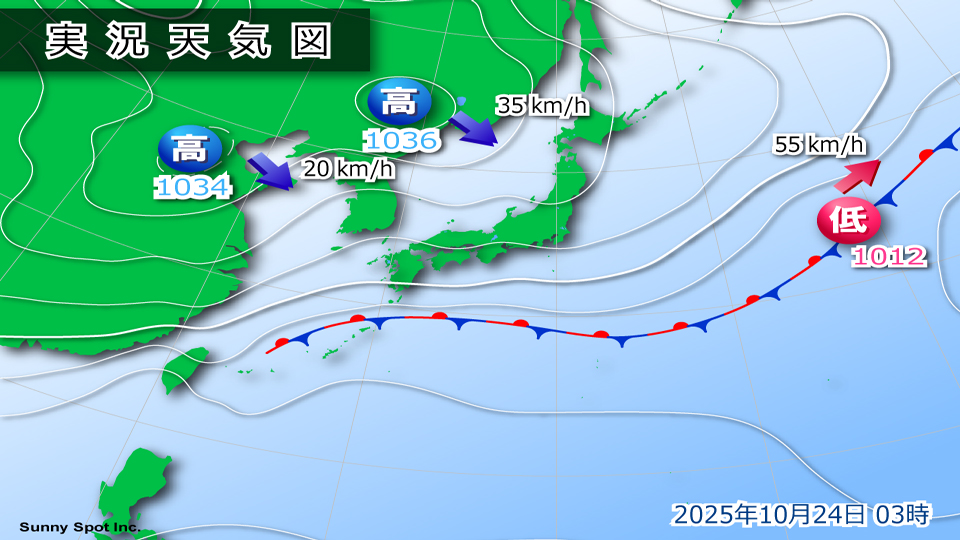 25日(土)、日本海西部に低気圧が発生して北東進し、夜には沖縄〜日本の南にのびる前線上に別の低気圧が発生するでしょう。