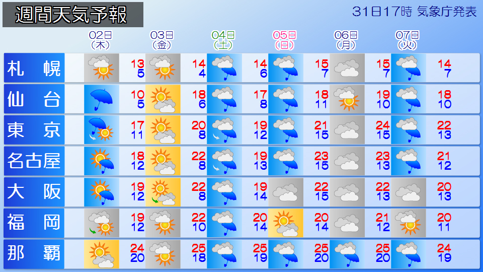 週間天気 前線や低気圧が本州付近を通過しやすく、週末は日再び広く天気崩れる予想