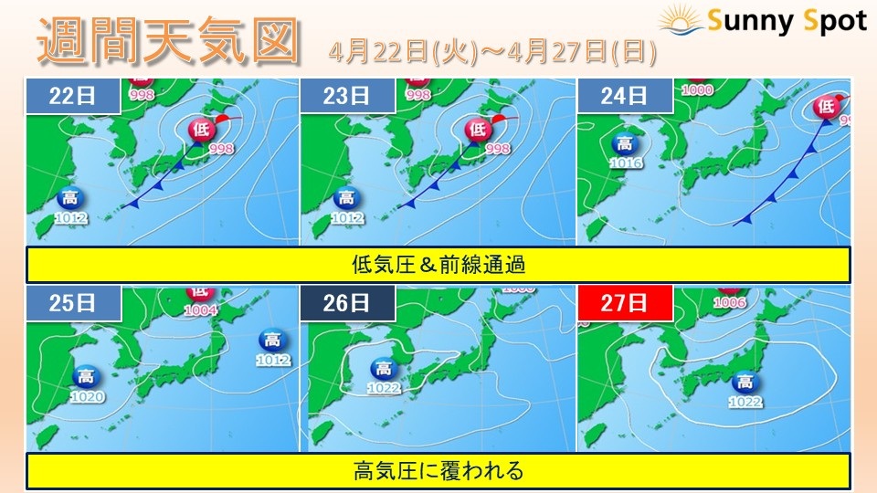そして、前線を伴った低気圧が日本の南を、別の低気圧が日本海を進み、西から天気下り坂。