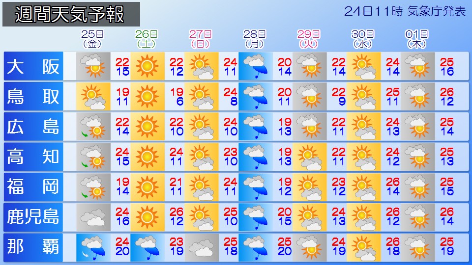 日中の予想最高気温は札幌1℃、仙台8℃、東京14℃、名古屋13℃、金沢11℃、大阪14℃、高知16℃、福岡15℃の予想です。