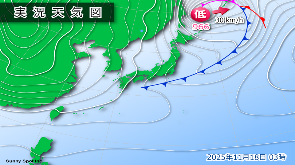 低気圧は今後、急速に発達しながらオホーツク海へ進む見込みで、今夜にかけて前線が本州付近を通過するでしょう。前線通過後は、本州付近は西高東低の冬型の気圧配置となって上空の強い寒気が南下、等圧線の間隔が狭まり、北よりの冷たい風が吹き付けるでしょう。
