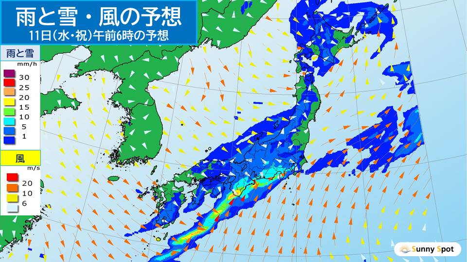 あす11日(水)祝日は全国的に雨や雪、東京では3か月ぶりのまとまった雨に