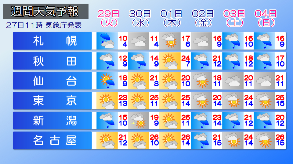 In Hokkaido, rain will likely fall on this weekend, Saturday the 30th, Monday the 1st and Tuesday the 2nd due to low pressure and fronts. Even on the Hokuriku and Western Japan Pacific side, rain is likely to fall due to the effects of low pressure and front lines, and it seems that there are some areas where the rain is getting stronger.