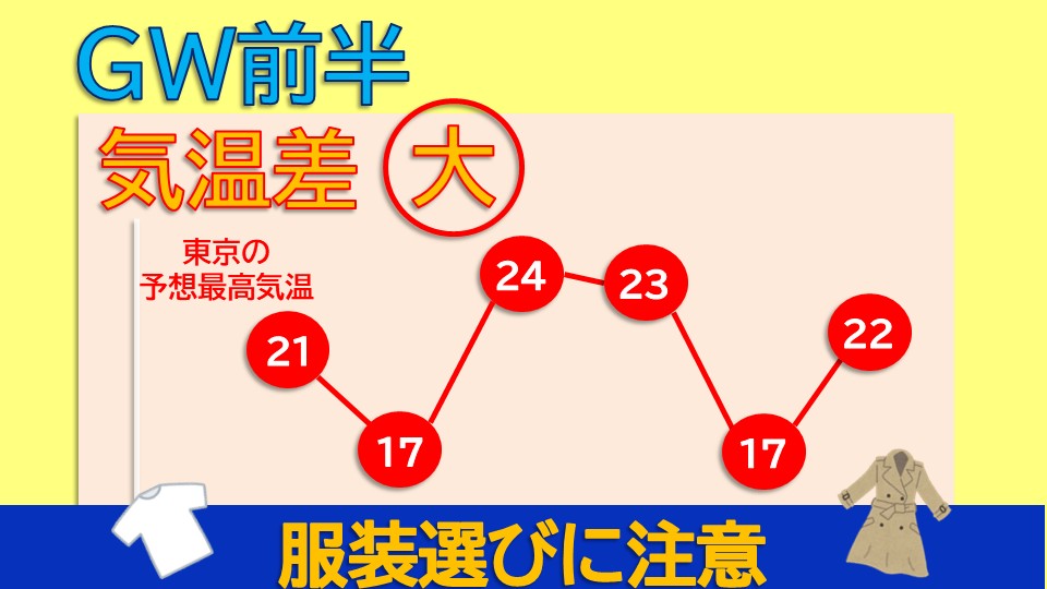 In the first half of Golden Week, be careful of temperature differences; choosing clothes is key.