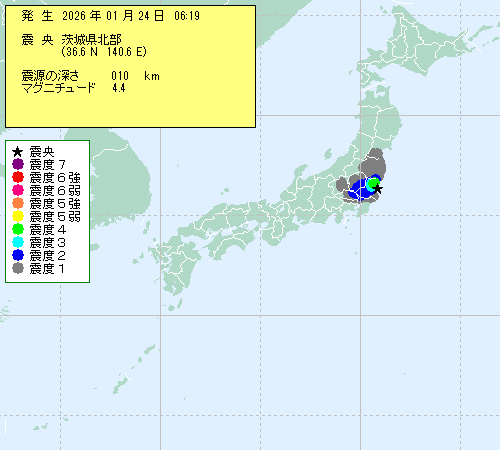 | 2026年01月24日 06時19分 | ?骭ァ?k?? (36.6N,140.6E) |