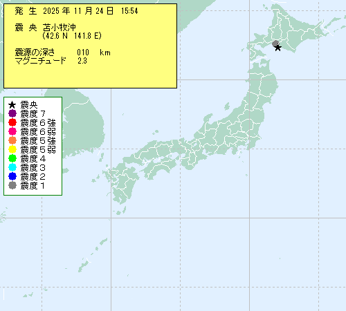 | 2025年11月24日 01時16分 | ????????東?? (42.8N,146.0E) |