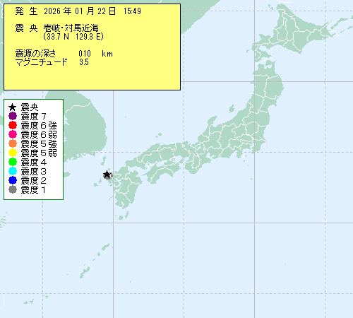 震源地は、壱岐・対馬近海 (33.7N,129.3E)