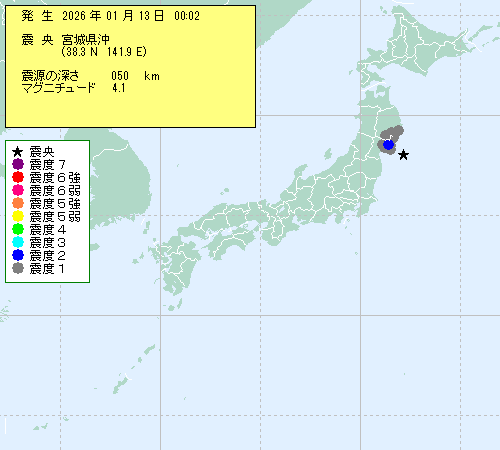 | 2026年01月13日 00時02分 | {?骭ァ?? (38.3N,141.9E) |