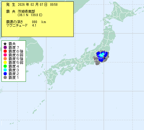 | 2026年02月07日 00時58分 | ?骭ァ?部 (36.1N,139.8E) |