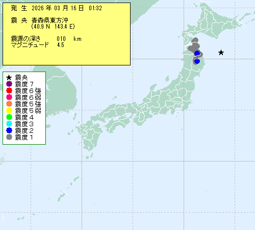 | 2026年03月16日 01時32分 | ツ森???????? (40.9N,143.4E) |