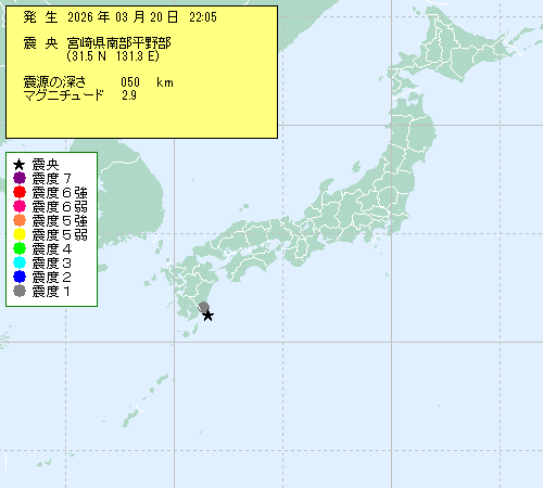 | 2026年03月20日 22時05分 | {?闌ァ?部???部 (31.5N,131.3E) |
