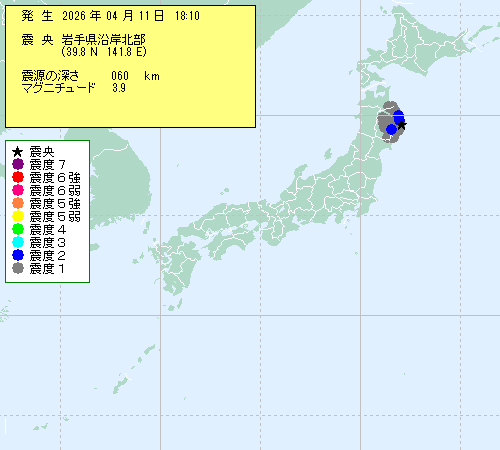 | 2026年04月11日 18時10分 | ?闌ァ???ン北?? (39.8N,141.8E) |