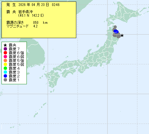 | 2026年04月23日 02時46分 | ?闌ァ?? (40.1N,142.2E) |