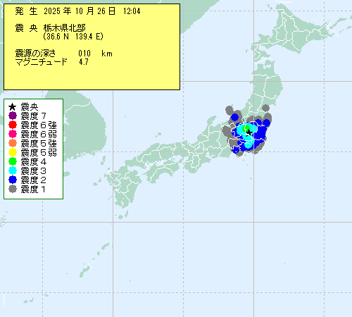 震度 3  高根沢町石末      日光市芹沼       日光市湯元