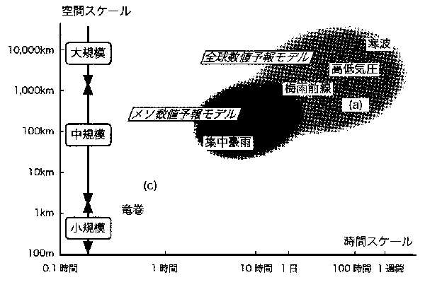 大気現象は,一般に空間スケールが大きいものほど時間スケールも長いという傾向を持っている。この関係からみると,(a)は同程度の空間スケールの現象の中では比較的寿命が長く,予報期間が長い全球数値予報モデルを用いて予報を行っている。集中豪雨は,対流雲で構成されている擾乱によって発生することが多く,大気の鉛直流の速度を直接予報する(b)方程式を用いたメソ数値予報モデルで予報を行っている。