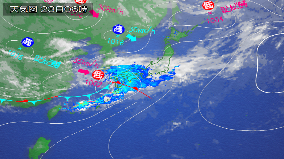 今週23日(木)〜24日(金)頃は広範囲で雨の予想 本州南岸を低気圧と前線が通過
