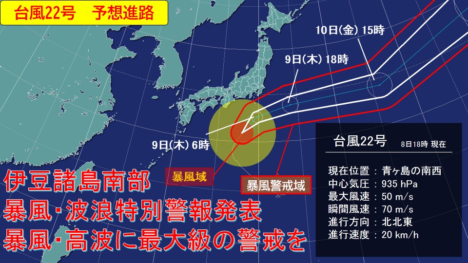 非常に強い台風第22号は、8日15時には青ヶ島の南西約300キロにあって、1時間におよそ20キロの速さで北北東へ進んでいます。中心の気圧は935ヘクトパスカル、中心付近の最大風速は50メートル、最大瞬間風速は70メートルで中心から半径130キロ以内では風速25メートル以上の暴風となっています。台風は非常に強い勢力を維持しながら、8日は進路を次第に東へ変え、9日明け方から朝にかけて伊豆諸島に最も接近する見込みです。また、前線が9日朝にかけて、日本の東から伊豆諸島付近にかけてほとんど停滞するでしょう。伊豆諸島では、これまでに経験したことのないような暴風や高波となるおそれがあり、特別警報を発表する可能性もあります。