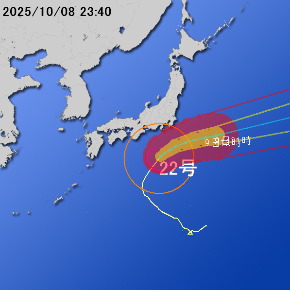 非常に強い台風第22号は、9日10時には八丈島の東にあって、1時間におよそ30キロの速さで東北東へ進んでいます。中心の気圧は940ヘクトパスカル、中心付近の最大風速は50メートル、最大瞬間風速は70メートルで中心から半径165キロ以内では風速25メートル以上の暴風となっています。