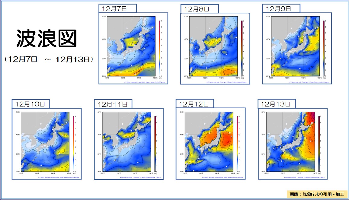 日本付近は気圧の傾きが大きくなり、日本海中部や北部、日本の東で波が高くなった。
