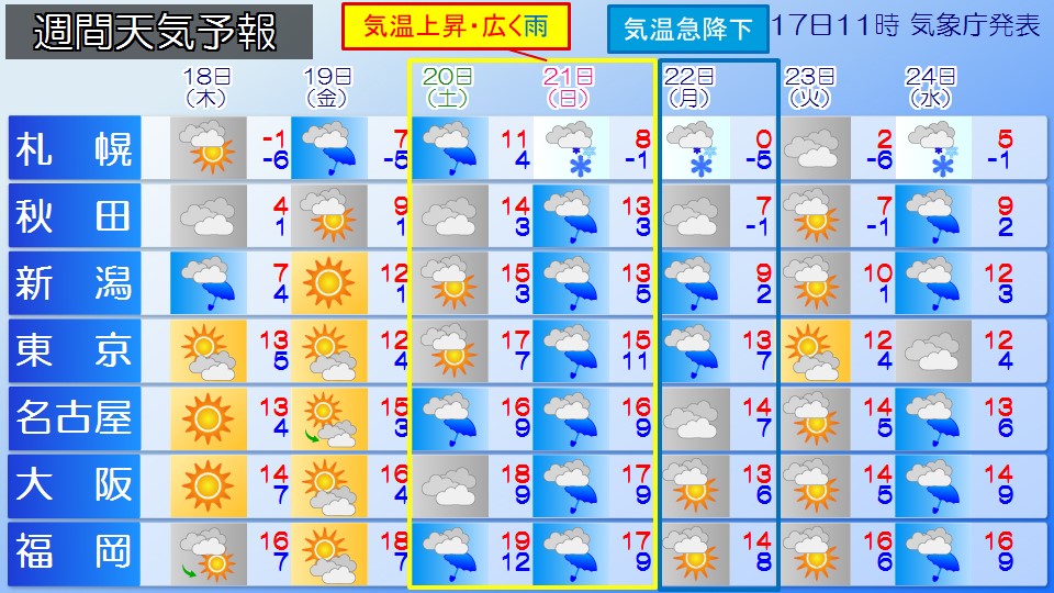 今週末は気温上昇・広く雨 関東など強雨の所も 週明けは気温急降下【週間天気】