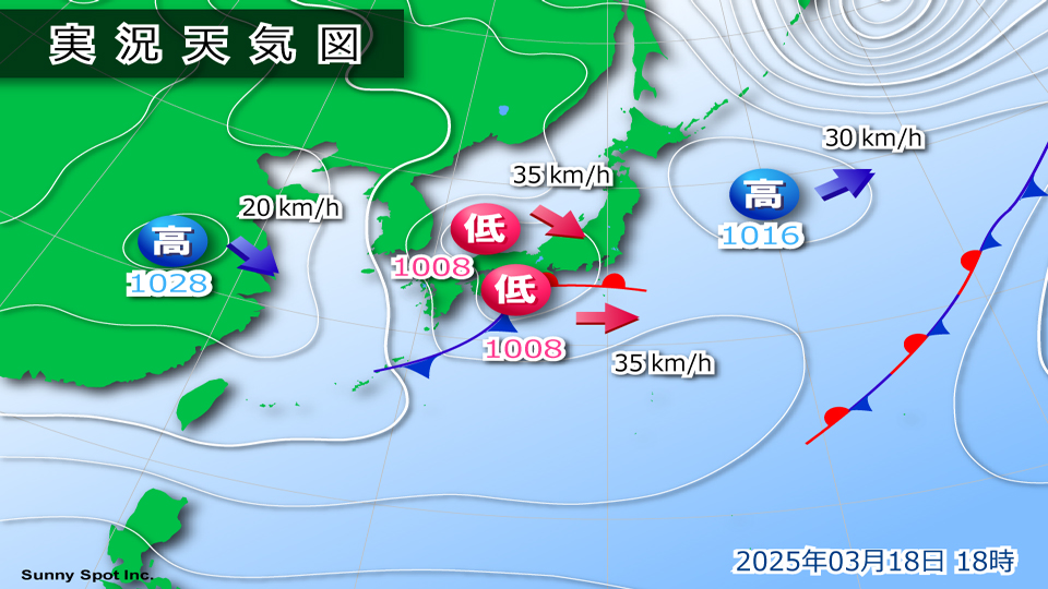 また、九州の南を進む前線を伴った低気圧は(赤い丸で囲んだ低気圧)