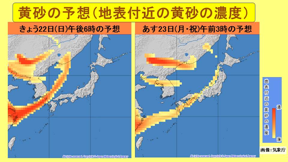 その後、きょう22日(日)夕方以降は寒冷前線の通過により、西よりの風に変わります。西日本では広い範囲で黄砂の飛来が予想されます。あす23日(月・祝)にかけて黄砂にご注意ください。