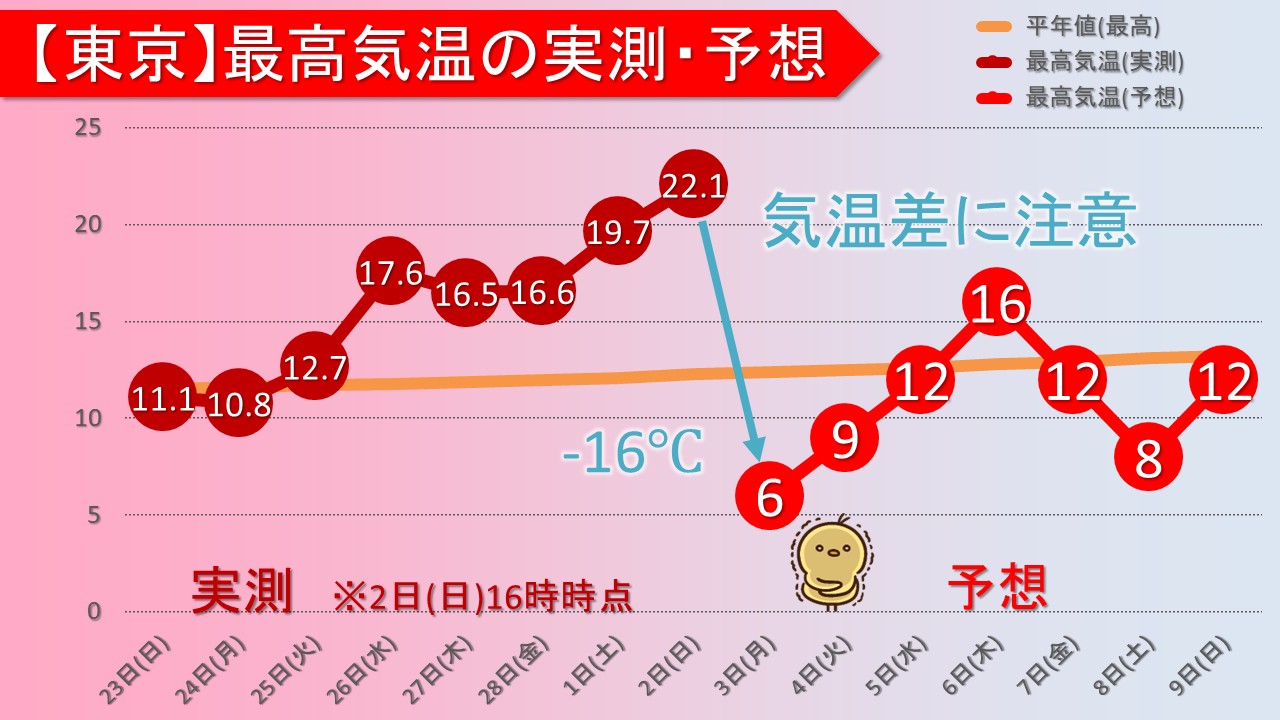 あす3日(月)は一日を通して気温が上がらず、予想最高気温は6℃と、きょうより16℃も気温が下がる見込みです。