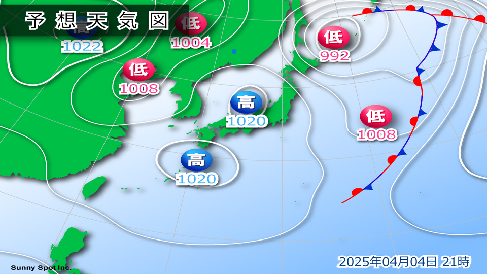 あす4日(金)は、本州付近は広く移動性高気圧に覆われる見込みです。北日本や新潟では、はじめ多少雨雲が残る所がありそうですが、本州付近は日中にかけて穏やかに晴れる見込みです。