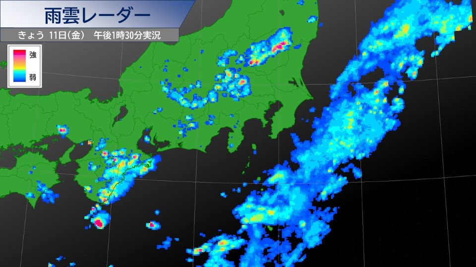 きょう11日午後1時30分の関東地方付近の雨雲レーダーの様子を見てみますと、群馬県や埼玉県付近に活発な雨雲が発生しているのが分かります。栃木県矢板市付近、塩谷町付近、群馬県桐生市付近では落雷を検知している所があります。