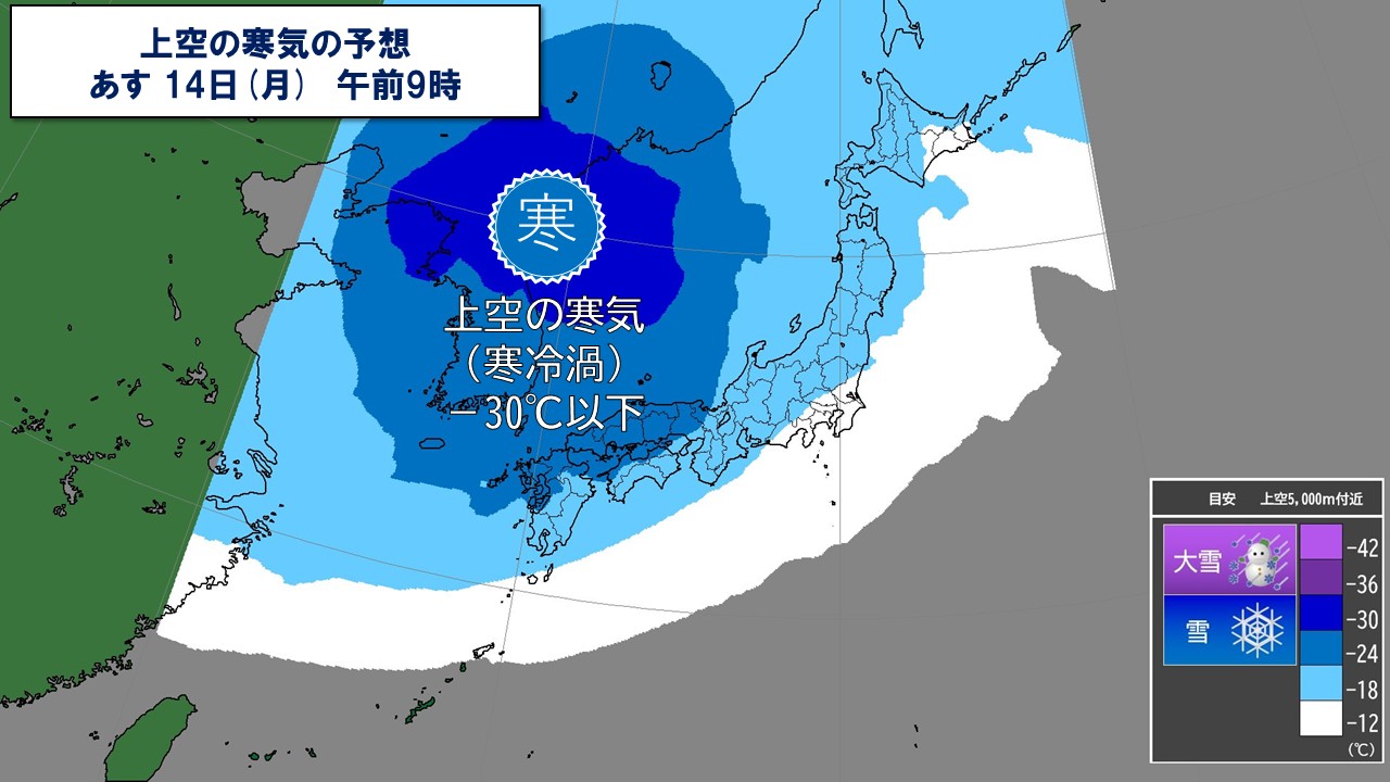 上空約5500m付近には-30℃以下の、この時期としては強い寒気が流れ込み、朝鮮半島付近を進む地上の低気圧に向かって暖かく湿った空気が流入するため、大気の状態が非常に不安定となる見込みです。