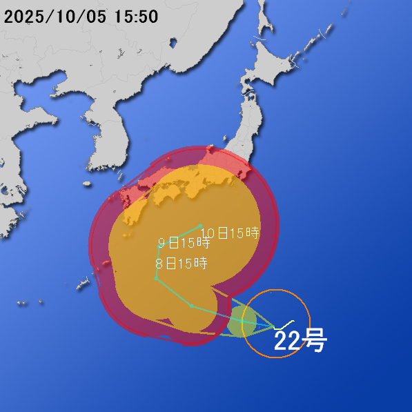 台風第22号は、5日15時には父島の南にあって、ゆっくりとした速さで西へ進んでいます。中心の気圧は1000ヘクトパスカル、中心付近の最大風速は18メートル、最大瞬間風速は25メートルで、中心の北東側280キロ以内と南西側220キロ以内では、風速15メートル以上の強い風が吹いています。